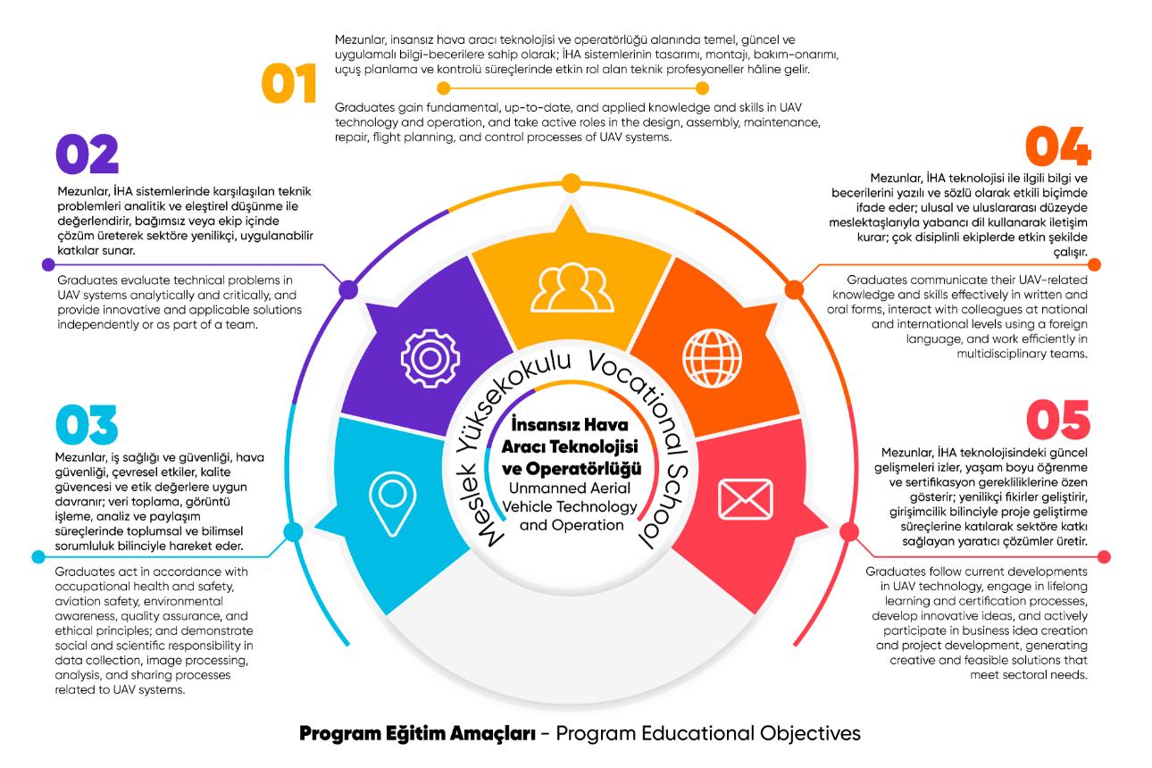 Mezunlar, insansız hava aracı teknolojisi ve operatörlüğü alanında temel, güncel ve uygulamalı bilgi-becerilere sahip olarak; İHA sistemlerinin tasarımı, montajı, bakım-onarımı, uçuş planlama ve kontrolü süreçlerinde etkin rol alan teknik profesyoneller hâline gelir. Graduates gain fundamental, up-to-date, and applied knowledge and skills in UAV technology and operation, and take active roles in the design, assembly, maintenance, repair, flight planning, and control processes of UAV systems. |